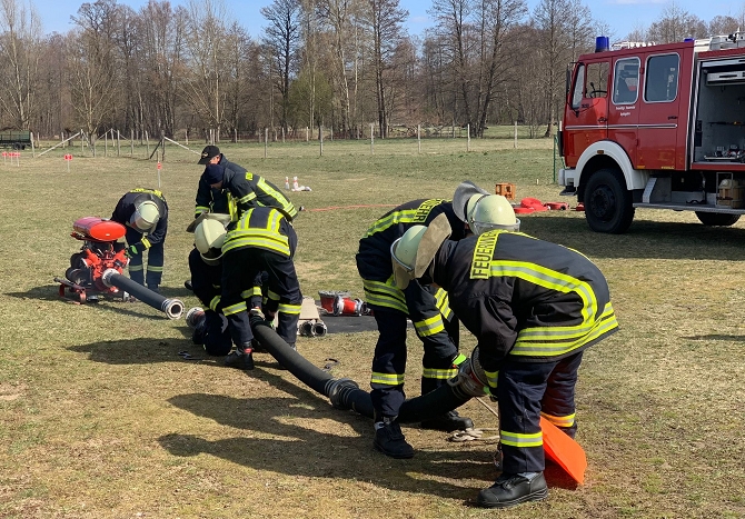 Die Truppmannausbildung des Amtes Lieberose/Oberspreewald fand heute in Byhleguhre statt. Der Übungsplatz hinter dem Gerätehaus bietet dazu genügend Platz. "Die Gruppe im Löscheinsatz" stand heute auf dem Plan, es wurde die Löschwasserentnahme aus offenen Gewässern geübt sowie das korrekte Ausrollen und Wickeln von Druckschläuchen. Die Ausbildung musste aufgrund eines Brandeinsatzes kurzzeitig unterbrochen werden aber die angehenden Truppmänner und -frauen befassten sich in der Zwischenzeit mit dem Legen und Binden von Knoten.